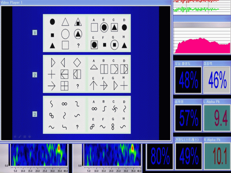 두뇌는 시각, 청각, 감각, 운동, 공간지각, 창조, 사고, 감정억제, 판단결정, 추리 , 장기.단기기억 등 매우 다양하게 그 기능을 발휘하도록 세분화된 영역으로 나누어져 있으며 각각의 기능을 수행하는데 따른 두뇌의 활동을 알아보기 위해서는 그에 맞는 기능을 수행하게 하면서 뇌파측정 분석을 해 보는 것이 중요합니다. 그리하여 본 연구소에서는 국제적으로 가장 인정받는 아이큐 테스트 문제인 레이븐 테스트 웩슬러 테스트 등의 유형을 직접 모디파이하여 개발한 도형 문제, 듣기 문제, 단어 찾기 문제, 읽기 문제, 숫자 대량 문제, 연산 문제를 제시하여 푸는 동시에 뇌파를 측정하여 데이터를 분석함으로써 그 동안의 어휘나 수리 등 지적인 부분 만을 검사하고 분석하던 비과학적인 방법을 탈피하여 두뇌 영역별 기능 수행에 따른 첨단 과학적 뇌파분석으로 학습 수행 성향을 파악할 수 있습니다.